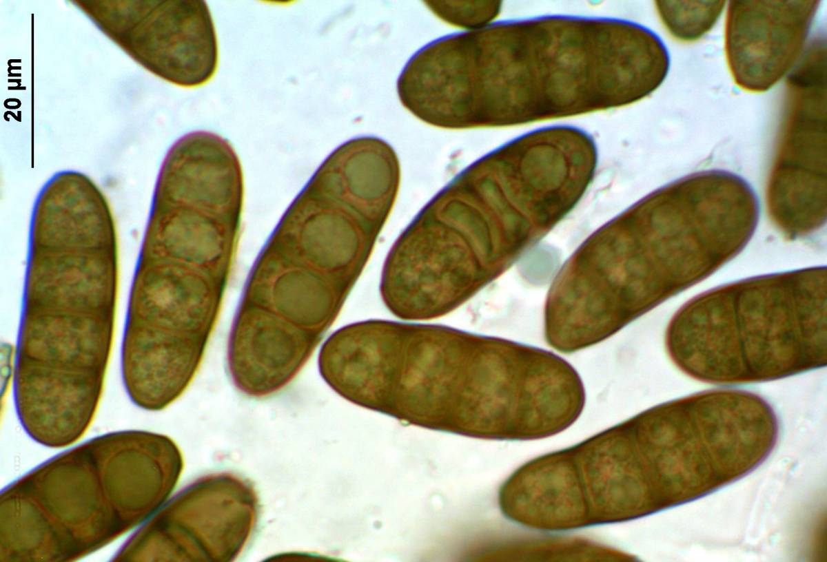 Gestern nun hatte ich solche Äste an Hainbuche beobachtet. Ursache solcher Staubentwicklung sind an dieser Baumart meist Anamorphen von Melanconiella-Arten (Diaporthales; dann mit braunen, elliptischen oder tropfenförmigen Konidien, „Melanconium cf. stromaticum“), der „Hyphomycet“ (Hauptfruchtform wohl unbekannt) Cheirospora botryospora, oder man findet, wie ich gestern, große, dunkel olivbraune, dreifach septierte Konidien – das sollte dann Stilbospora macrosperma sein.