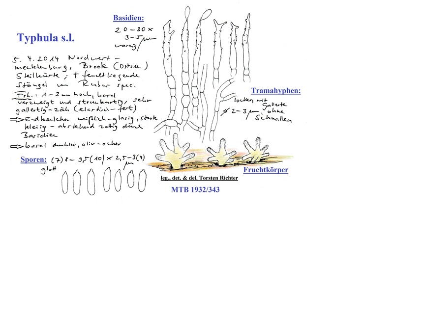 Torsten hat mich gebeten eine Doku einzustellen, weil er Hilfe sucht: Vielleicht kann ja jemand helfen. Die Typhula (??) hat ja sehr bemerkenswerte Basidien--etwas warzig. Jedenfalls sehen die aus wie Zystiden, aber ich sah daran die Sporen hängen..ist nur eine Skizze, aber vielleicht hat ja Jemand sowas schon gesehen. Ein Foto kommt auch gleich noch.
