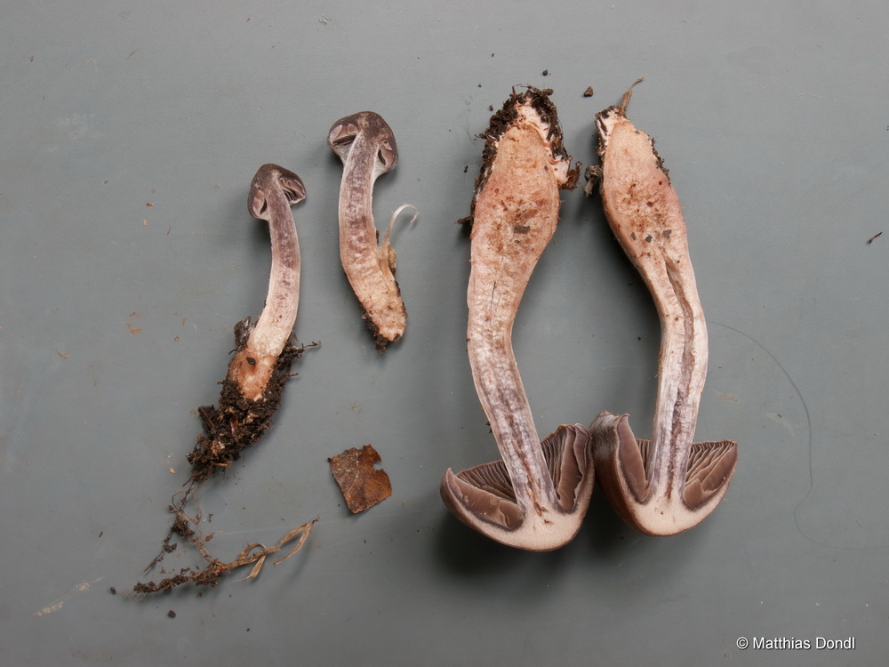 Stiel: bis 6 x 0,6 (Keule bis 1 cm dick), basal spindelig-keulig, hohl, undefinierbar cremebeige, silbrig glänzend, an der Spitze mit blaulila Ton, basal mit leichter Tendenz zum Röten; Velum sehr dünn, wohl weißlich;