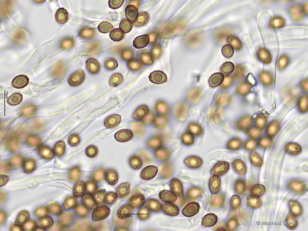 Sporen: breit ellipsoid bis subglobos, Apex breit gerundet, subapikulär bisw. etwas abgeflacht, isoliert stachelwarzig, Warzen dicht und mäßig dick, aber relativ hoch und deutlich überstehend, Maße: 7,0 x 4,9 (6-8 x 4,5-5,5), Q=1,44 (1,31-1,67), 20 Sp. gemessen;