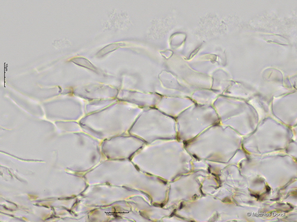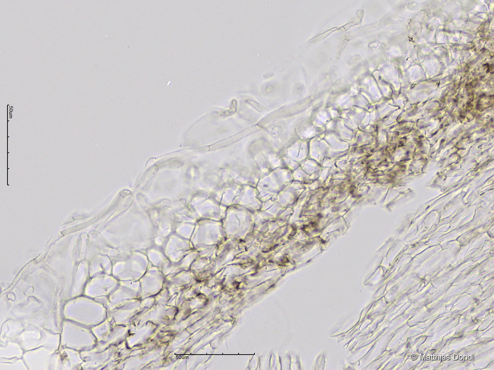 HDS: Sehr eigenartiges Hyphoepithelium, mit dickem, zelligem Hypoderm, darüber teils aufragende kurze, keulige oder zylindrische Endzellen, teils auch längere, liegende, septierte, schmale Hyphen; Hypodermzellen dickwandig mit gelbem bis bernsteinfarbenem, teils grob inkrustierendem Dickwandpigment; Epicutishyphen teilsweise schwach gelifiziert, gelbbraun quergestreift inkrustiert, stellenweise auch mit goldgelbem intrazellulärem Pigment (Nekropigment?); ohne Schnallen;