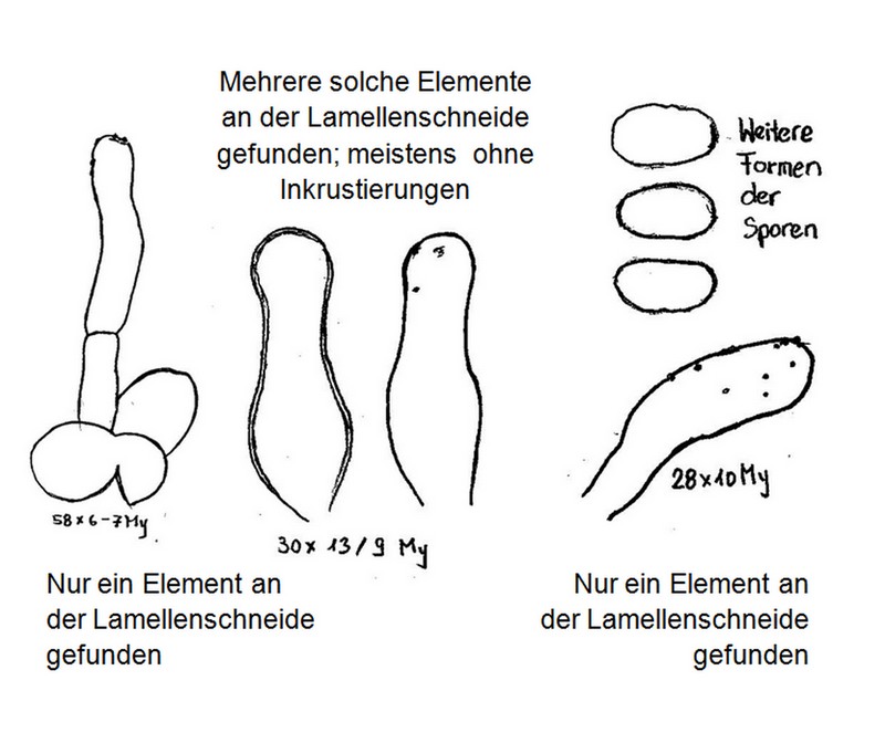 Die bereits skizzierten und alle neu gefundenen Elemente fanden sich an den Schneiden der Lamellen. Es gibt offensaichtlich keine Pleurozystiden. Kaum eine der Zystiden zeigte Inkrustierungen.