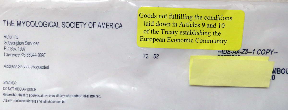 Hallo´le, Falls hier jemand die "Mycologia" bezieht: Auf dem Umschlag des letzten Bandes (kam gestern) war dieser gelbe Sticker geklebt (Foto). Ist der von unserer (luxusbürgerischen) Post aufgeklebt worden, oder habt ihr den auch drauf? Weiss jemand was das bedeutet? Bin ich nun auch im Visier der NSA ?-))). Ciao,