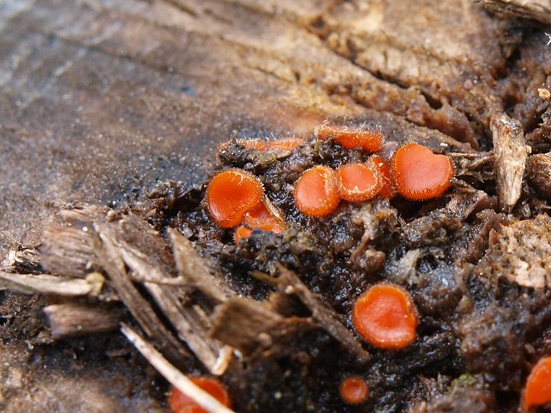 Einige frische Holz-Schildborslinge (Scutinella scutellata), eben mal mit ca. 2 mm im Durchmesser an Kiefer.