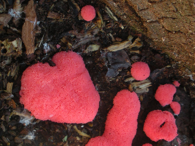 Liebe Pilzfreunde, diese netten, himbeerroten Dinger habe ich mal mit einiger Sicherheit als Tubifera ferruginosa angesprochen.