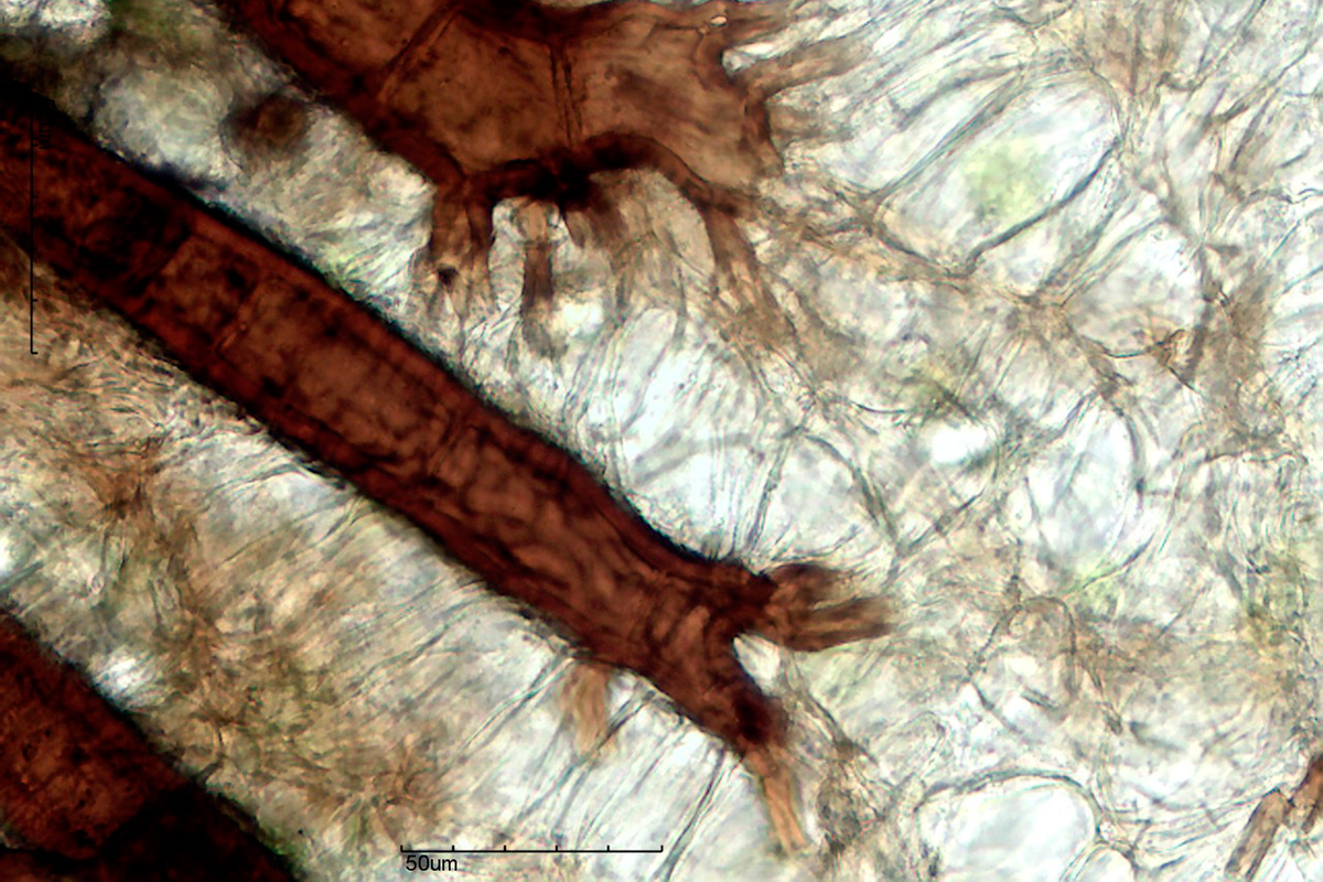 Haare am Becherrand bis ca. 800 µm, an der zur Basis hin dicksten Stelle 30 µm (bis teils 45 µm), oben zuspitzend, Wand 5-7 µm, basal vorwiegend wurzelnd.