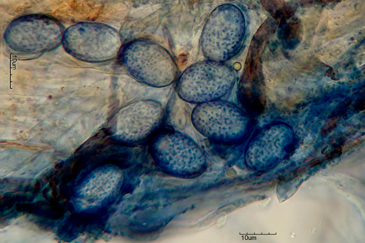 Freie Sporen sind breit-ellipsoid, Ornament aus unregelmäßigen „Flecken“, die nur manchmal zu Graten verbunden sind.