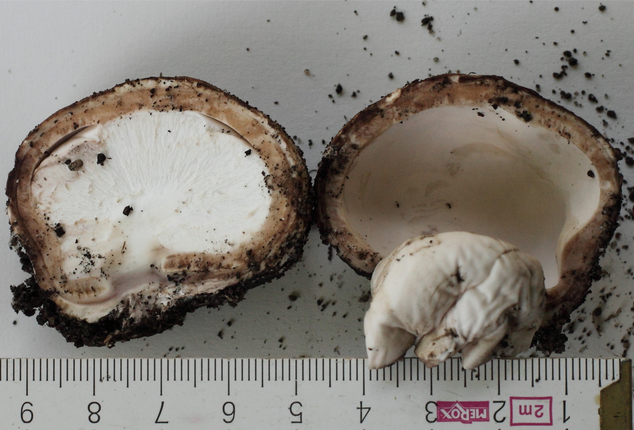 Anfangs dachte ich ja an einen Bovist, aber nach dem Aufschneiden kamen mir Zweifel. Da ich bisher keinen auch nur ähnlichen Pilz gefunden habe, benötige ich dringend einen Tipp. WAS IST DAS? Die Hülle ist fest, ähnlich wie eine Kastanienhülle. Die Gleba lässt sich sehr leicht herauslösen und ist sehr weich und zusammendrückbar. Geruch: leicht säuerlich, sonst unauffällig. Von dem Pilz schaute nur maximal das obere Drittel aus der Erde heraus. Die Oberfläche der Hülle ist grob braun geschuppt wie bei einem Waldchampignon (Agaricus silvaticus).
