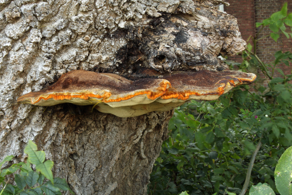 Dieser Porling steht an einer alten Eiche bei Kleve. Leider - ich komme wegen Privatgrundstück, Zaun und Gestrüpp nicht nöher heran. Könnte das ein überständiger Inonotus hispidus sein?