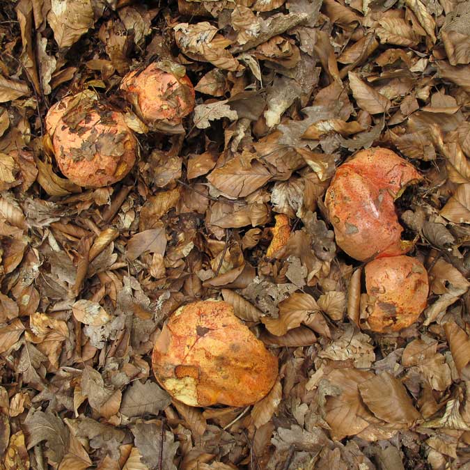 Schwarzhütiger Steinpilz Boletus aereus Geotropismus scheint aber für seine Kollegen rechts unterm Laub ein Fremdwort zu sein.