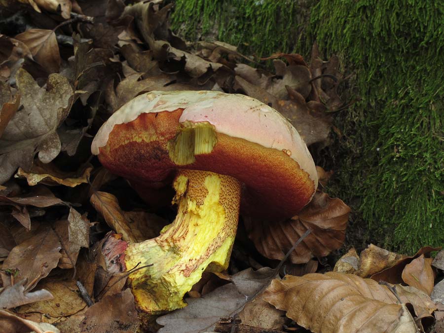 Blaßhütiger Purpur-Röhrling Boletus rhodoxanthus Rotes Netz auf gelbem Grund, heller Hut mit rosalichem Rand und gelbes Fleisch, das sich nur im Hut blau verfärbt.