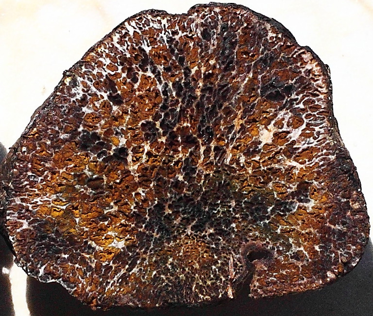 Leider kann ich mangels Mikroskop nicht Mikroskopieren. Aber Octavianina asterosperma scheint mir von Vergleichsbildern im Netz her recht gut zu passen. Ist der wirklich intensive, unangenehm obstartig - faulig - süßliche Geruch (erfüllt den ganzen Raum, sobald die Pilze darin sind, Lüften macht es nicht besser :( ) typisch? Und hat Octavianina asterosperma ein gelbes Mycel? Dazu konnte ich leider nichts finden. Ich hänge gleich nochmal einen vergrößerten Querschnitt an. Da sieht man sehr gut die Verfärbungen von gelb - braun bis blau - grün.