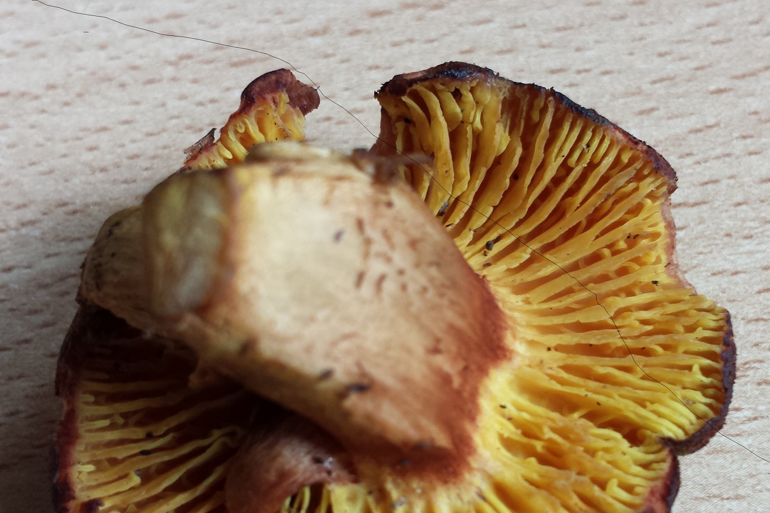 : Und da sah das dem Fund schon recht ähnlich.. Außerdem sind Querverbindungen der Lamellen zu erkennen... das Oberseitenfoto ist etwas rotstichig.. Ist schön Braun und ich dachte ich hab einen Rotfußröhrling oder Ziegenlippe vor mir
