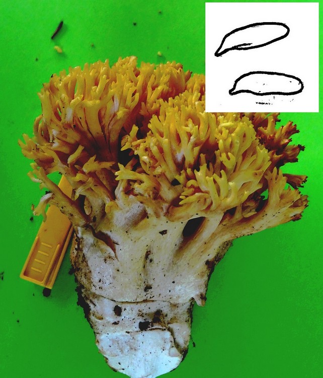 Farbe der Leitäste: Nach 2 Stunden blasses Bananengelb und etwa Y65% / M20% gemäss Josef Christan; Körpergrösse 12cm breit und bis 10 cm hoch; tief gründend in kalkbasischer fester Erde; Sporen: Glatt und L x B => 10.3-11.4-12.3 x 3.6-4.0-4.3 My; Q = 2.4 - 2.9 - 3.2; Astgabeln bis spitz gekerbt; Fleisch weisslich; Vorkommen bei Fichten