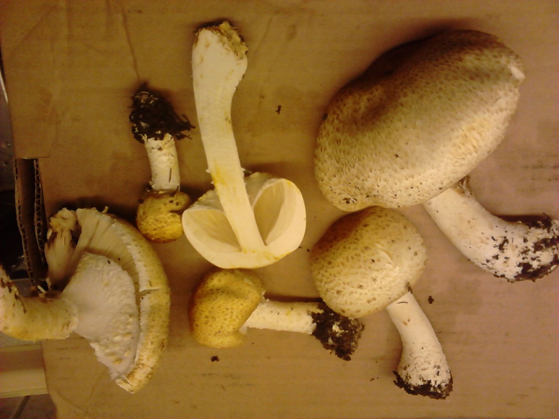 Unberührte Lamellen leicht beige-weiß, erst nach Berührung (hesteres seitliches drücken auf die Lamellen) werden sie LEICHT Rosa (etwa 1 Minute später). Die gelblichen Schleier am Stiel des durchgeschnittenen habe ich ziemlich sicher mit dem Messer von der Huthaut her "runtergezogen", ein nachschnitt 2 mm tiefer ergab keinen gelblichen Schleier, und auch sonst keine Verfärbung im Bereich Stiel. Die jungen 2 Fruchtkörper habe ich auch noch durchgeschnitten, und diese zeigten exakt im Zentrum der Hutpitze (über dem Stiel, im Fruchtfleisch unter der Huthaut), und zwar NUR DORT, unmittelbar nach dem Schnitt beide eine fast kreisrunde, leichte, aber deutliche hellblau-Verfärbung. In der Nähe gab es wunderbar knackige junge Fichtenreizker, die ich eben in Butter gebraten aus der Pfanne verspeist habe. Die Agaricus (??) habe ich mich nicht getraut, kulinarisch zu verwerten.. Das Foto ist etwas gelb-stichiger als in Natura. Was könnten es für welche sein?