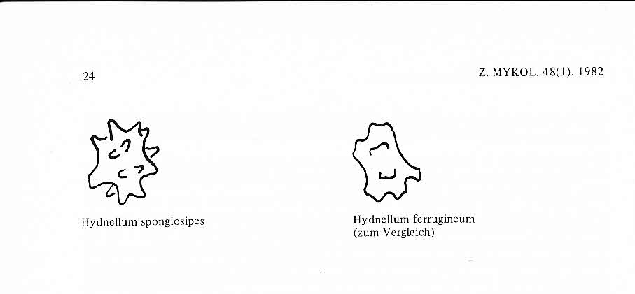 Servus Harzi, Hydnellum ferrugineum wächst in den Oberpfälzer Sandkiefernwäldern teilweise zum "Sau füttern". Er kann unglaublich vielgestaltig sein. In einem Laubwald habe ich Ähnliches aber noch nie gesehen und deshalb war ich noch nicht mit dem Thema "ferrugineum vs. spongiosipes" konfrontiert. Weil ich die Korkstachelinge schon immer spannend finde, habe ich mal ein wenig ältere Literatur gewälzt. In Pegler et al. 1997 ("British Chanterelles and tooth fungi") wird explizit auf die Ähnlichkeit hingewiesen und nur zwei Unterschiede herausgestellt: H. spongiosipe wächst bei Laubbäumen und hat einen blasseren und deutlicher zonierten Kontext. Das könnte aber auch von der jeweiligen Bodenfeuchte beeinflusst werden. Jülich 1984 gibt als Schlüsselmerkmale ebenfalls Laubbäume an und die von Dir schon genannten Sporenhöcker, die "stark eingedellt bis zweiteilig od. stachelig" sein sollen. Bei der meist recht unregelmäßigen Sporenform ein wohl schwierig zu beurteilendes Merkmal. Engel 1982 (Z. Mykol. 48 (1): 21) schlägt in die selbe Kerbe und bringt einen direkten Sporenvergleich in einer Zeichnung - allerdings leider nur mit jeweils einer Spore (siehe Anhang). In den Zeichnungen in anderen Quellen ist dieser starke Unterschied nicht nachvollziehbar. Da stellt sich die Frage nach der Bestimmung, wenn man mal wirklich einen solchen Korkstacheling im Mischwald findet. Beide gedeihen auf nährstoffarmen Sandböden, beide riechen im Schnitt mehlartig. Übrigens sind auf Deinen Bildern auch Nadeln zu sehen. Vergleiche auf DNA-Basis habe ich nicht gefunden (in den alten Büchern sowieso nicht). Resümée: Viel Text und keine klare Aussage zu Deiner Frage. Gruß Helmut