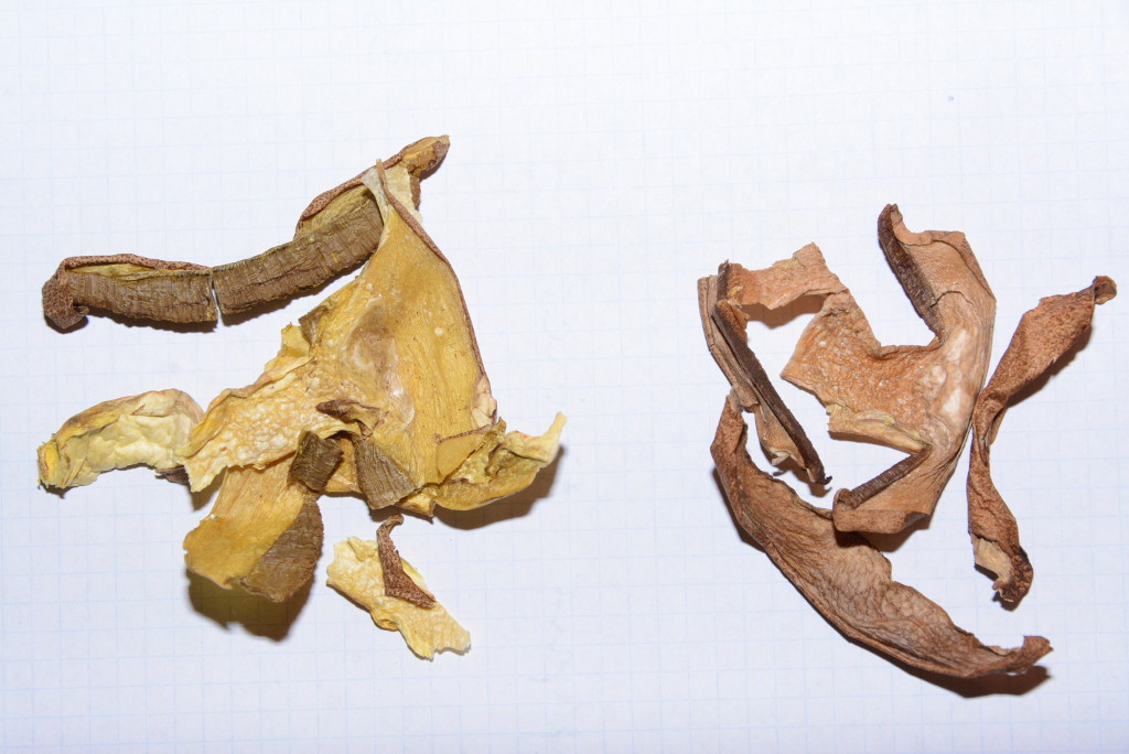 So, jetzt noch ein Foto der getrockneten Pilze. Links die "Gelben" rechts der "Pergamentig Braune". Der Geruch der getrockneten Pilze ist eindeutig verschieden.
