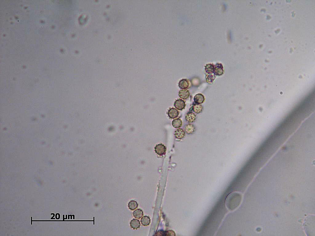 Das die Sporen fast glatt sein sollen, schreibt sonst keiner (nicht Dörfelt, nicht PdS). Ich habe Wärzchen bis 0,6 µm Höhe gemessen. (literatur bis 0,4 µm) Die Sporen [95% • 20 • SAP • v • H2O(nat) ] = 2,9 - 3,1 - 3,4 x 2,6 - 3 - 3,3 µm streuen lange nicht so, wie in der Literatur (3-4 µm) angegeben. Ich habe leider nirgendwo ein Sporenfoto von G. fimbriatum gefunden :(
