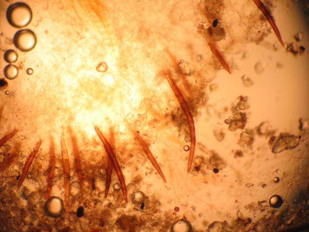 hallo Dirk, Sporen [95% • 46 • SAP • v • H2O(nat) ] = 14,9 - 17,2 - 19,5(20,3) x 14,4 - 16,8 - 19,1(19,9) µm Die Haare habe ich damals nicht vermessen, hänge aber ein Foto an, dass zeigt, wie kurz sie im Vergleich sind. In der Mitte ist ein Ascus zu erkennen.