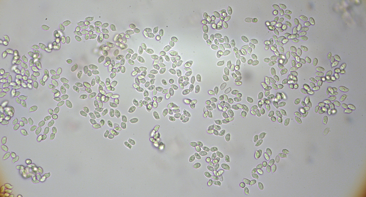 Ich bin ratlos und hoffe, dass der frische Pilz noch ein wenig durchhält! Die Beiden waren nämlich die einzigen Frk. an dieser Stelle... Über weitere Ideen + Tipps würde ich mich freuen! Vielleicht bekommt dieser Fund doch noch einen Namen? Anbei noch ein Foto mit eine ganze Menge Sporen (320x). Viele Grüße – Rika