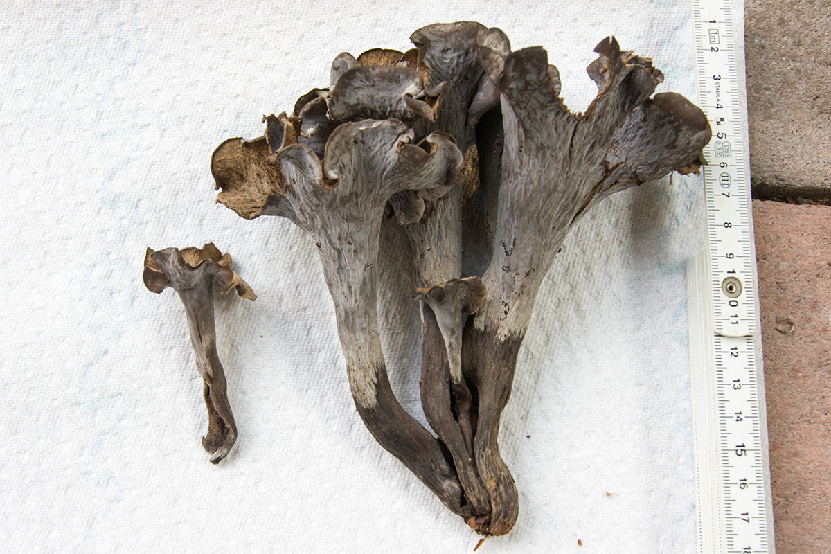 Herbsttrompeten hielt… Die FK sind allein im dunklen Stielbereich eines Büschels so massig wie sonst gesamte Büschel dieser Pilze im Kleinformat.