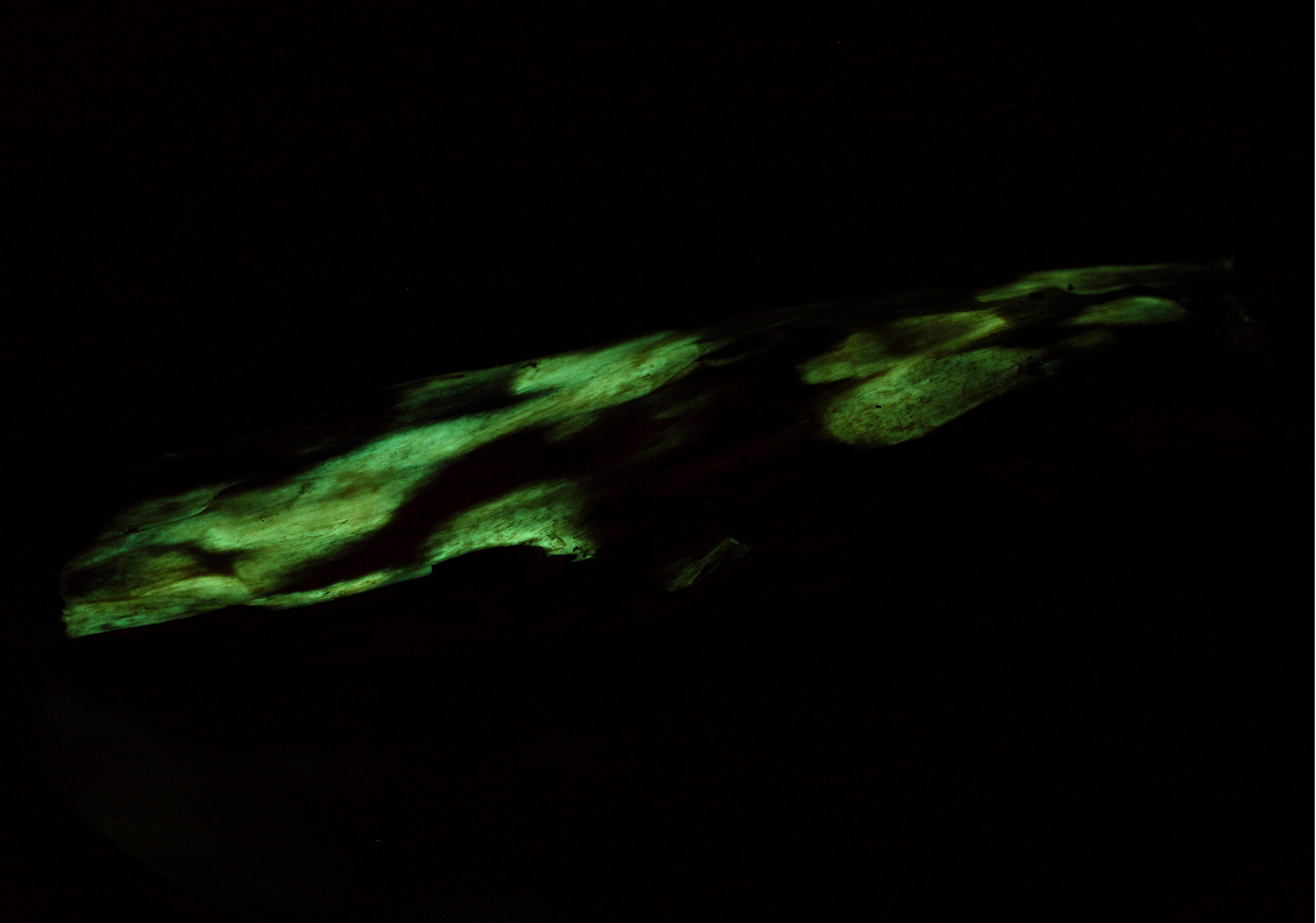 Nach einem Tag in der Plastekiste leuchtet das Holz immer intensiver. Als Mykophiler muss man das einfach einmal gesehen haben! Einfach ein Stück von Hallimasch befallenes Holz mit nach Hause nehmen, feucht halten und ein paar Stunden warten. Mehr habe ich auch nicht gemacht. Manche Proben haben sofort geleuchtet. Andere erst nach einem Tag. Sehen kann man das Leuchten allerdings nur bei vollkommener Dunkelheit.