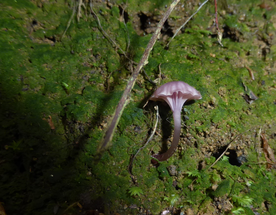 ... beim Kartieren in der Eifel hatte ich das Glück, eine Pilzart das erste Mal in meinem Leben zu sehen: Chromosera viola. Sie wuchs in einem Algenrasen oder Protonema (ich habe leider keine Probe mitgenommen) an einer Böschung in einem mäßig sauren Buchenwald. Es war nur ein Fruchtkörper.