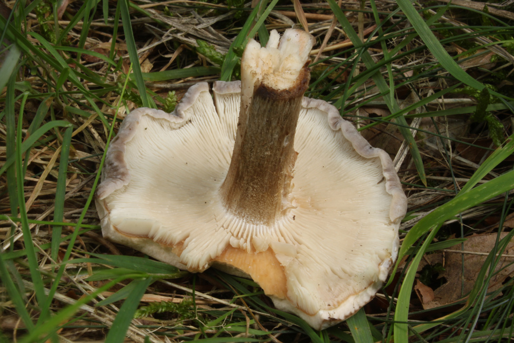 Deutlich - dichte weiße Lamellen, die etwas am Stiel herablaufen. Geruch schwach nach Mehl, Geschmack angenehm. Beachte den braunen Lamellenboden. Leider kein Sporenabwurf mehr.
