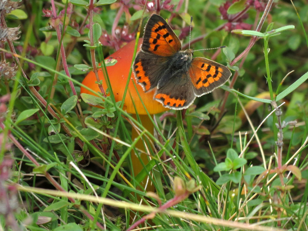 Kleiner Feuerfalter (Lycaena phlaeas) auf Kegeligem Saftling (Hygrocybe conica) in der Kleinen Mehlinger Heide. Gruß aus der Pfalz