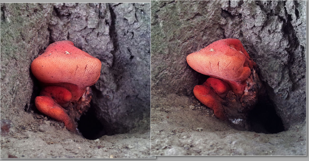 Fistulina hepatica, wuchs neben dem Höhleneingang eines unbekannten kleinen Waldbewohners.