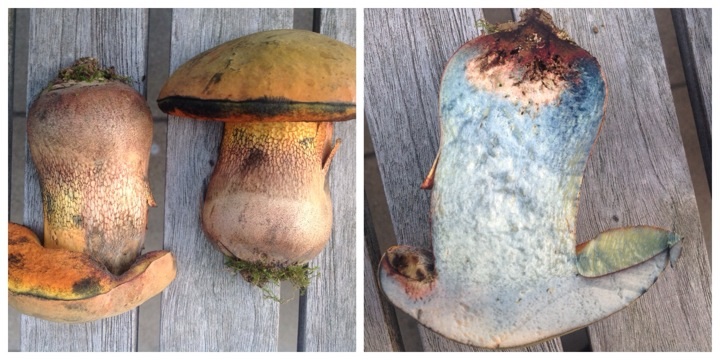 Im Park vor unserem Haus wachsen diese Hexen, am Stiel immer unten rum flockig und oben rum netzig. Begleitbäume sind Linden. Jetzt hab ich ein paar mal was von boletus mendax gelesen, aber diese Exemplare haben nur in der Stielbasis rötliches Fleisch. Und zum boletus caucasicus fehlt der gelbe Röhrenboden. Was sind das für verhexte Hexen?