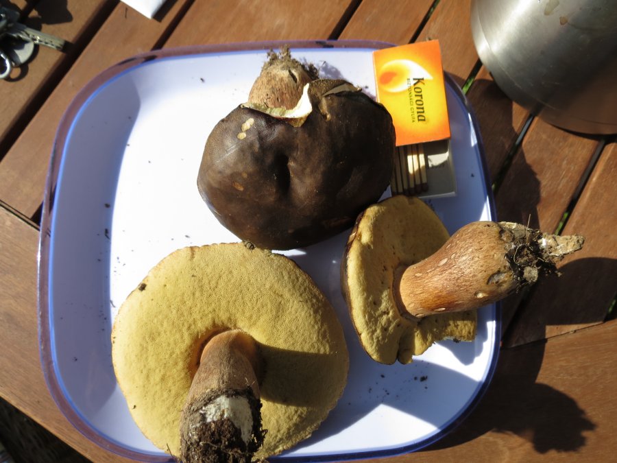 Ich bin immer noch in unserem Sommerhaus in Ungarn und wir haben in der Umgebung zum allerersten Mal seit Jahren eine große Anzahl großer Röhrlinge (neben auffällig vielen grünen Knollis), die aber irgendwie alle anders aussehen als der normale "Steinpilz" in den Wäldern in Deutschland. Es sind wohl mehrere Arten, der häufigste ist wohl der unten. Die Röhren sind manchmal auch noch heller, fast weiß, bei größeren Exemplaren aber auch dunkler und "schmutziger". Mir kommt eigentlich nur der Porphyrröhrling in den Kopf. Oder ist das noch einmal etwas ganz anderes?