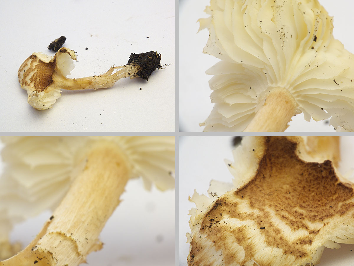Die Sporen sind ellipsoid, dextrinoid und nicht metachromatisch. Ihre Größe beträgt 5,7-6,3-7,0*3,4-3,8-4,3 µm. Schnallen sind vorhanden, Cheilozystiden habe ich keine gefunden, das muss aber nichts heissen. Bei der Hutdeckschicht muss ich passen, ich bekomme immer noch keine anständigen HDS-Schnitte hin, mit der Länge von irgendwelchen Haaren kann ich nicht dienen. Allerdings fand ich sehr vereinzelt in der Hutdeckschicht keulige Elemente, die aus wenigen blasigen bis elliptischen Elementen bestehen (s. Mikrofotos).