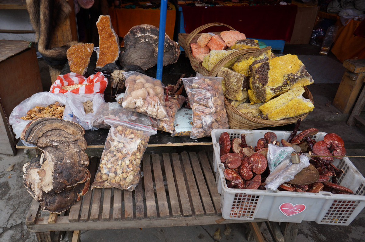 Hallo miteinander! Dieses Bild bekam ich von einer Tibet-Reisenden. Sie berichtete, dass getrocknete Pilze oft und in großen Mengen angeboten wurden. Vorne rechts sind klar Gestielte Lackporlinge (dahinter Bienenwaben und Steinsalz?). Sind die großen Baumpilze Zunderschwämme? Was könnt Ihr noch erkennen? Viele Grüße – Rika