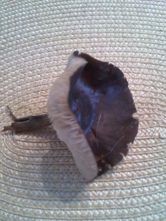 Ich kann den Fruchtkörper nur makroskopisch beschreiben: Hut graubräunlich, gewellt, jung in der Mitte einen kleinen Buckel. Die Lamellen weiß bis cremefarben, vom Stiel ringförmig abgesetzt. Zwischendurch auch kurze Blätter, die nicht bis zum Stiel reichen. Der Stiel ist eher dünn, faserig und im Anschnitt dunkelbräunlich.