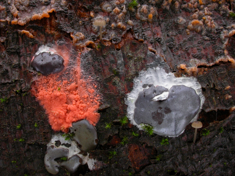 Liebe Pilzfreunde, da haben sich auf einem morschen Buchenstamm auf engstem Raum gleich 4 Arten zusammengeballt. Das eine ist Phlebia radiata. Der antrazitfarbene Schleimi dürfte eine Fuligo sein. Bei dem Helmling muss ich passen und das eosinfarbene Plasmodium fängt gerade erst an kleinste Kügelchen zu bilden. Weitere Benennungsvorschläge sind willkommen. Gruß