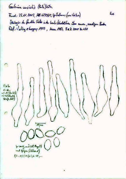 Servus Ingo, ich habe eine Fund-Doku aus 2003, auf den Tag genau vor 11 Jahren, bestimmt nach der damals verfügbaren Literatur. Die Art wuchs an feuchter Stelle in der Nähe eines Weihers in der Laub-/Nadelstreu über saurem Sandboden. Ein Exsikkat ist vorhanden, aber leider kein Foto. Ich hänge mal mein damaliges Mikro-Arbeitsblatt an (eingescannt und kontrastverstärkt). Die Fund-Aufzeichnungen (Beschreibung) müsste ich erst heraussuchen. Gruß Helmut
