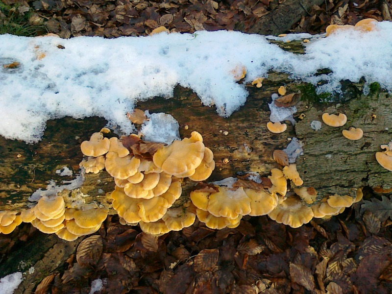 Halo, gestern habe ich mal wieder nach meinen Orangeseitlingen geschaut, die ich seit Anfang Dezember beobachte, nach harten Frostnächten sehen die noch aus "wie neu".