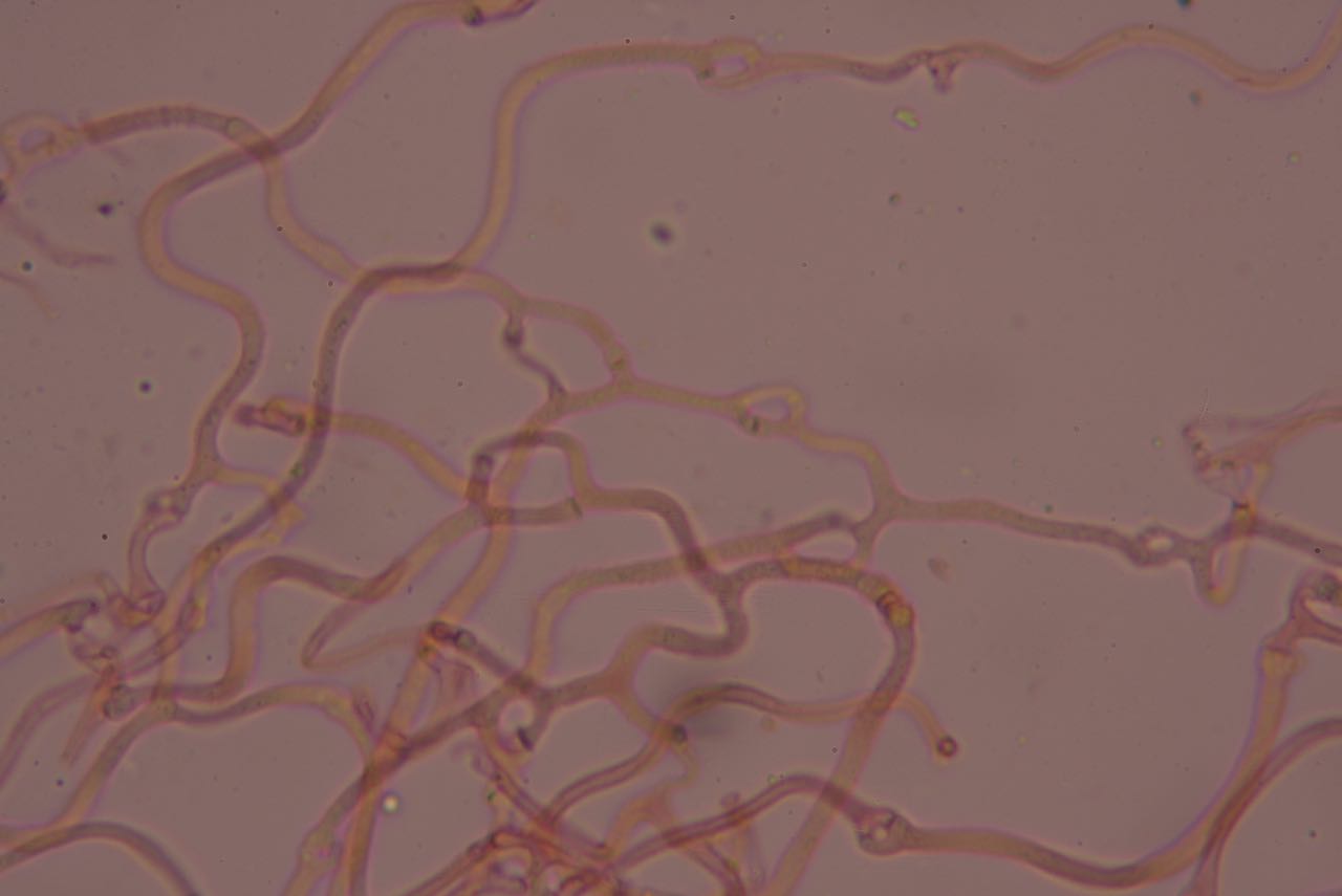In der gelatinösen Schicht auf dem Hut von Hohenbuehelia pinaceorum bin ich auf merkwürdige Verzweigungen der Hyphen mit Wiedervereinigung zu einer Schlinge gestossen. Im Gegensatz zu einer Schnalle gibt es hier zwei Septen.