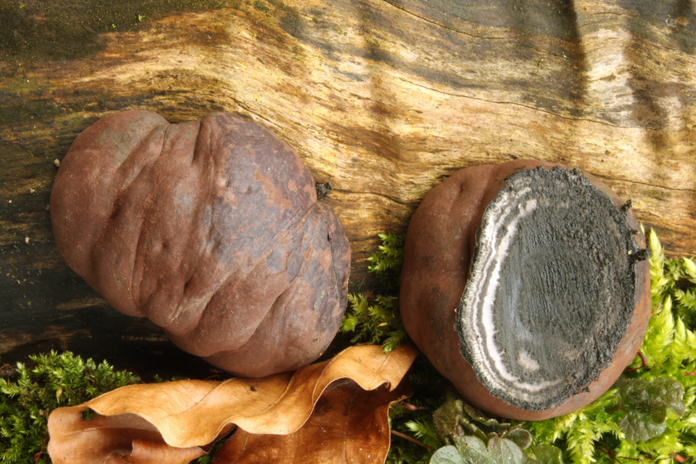 | Diesen Pilz - ich vermute Daldinia concentrica - fanden wir heute am 28.2.2015 an einem Eichenstamm im Kalbecker Bruch bei Goch am Niederrhein. Könnte das stimmen? Durchmesser des Fruchtkörpers etwa 2 cm bei recht hohem Schnittwiderstand.