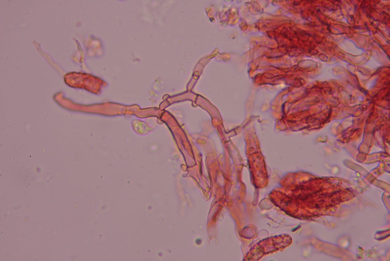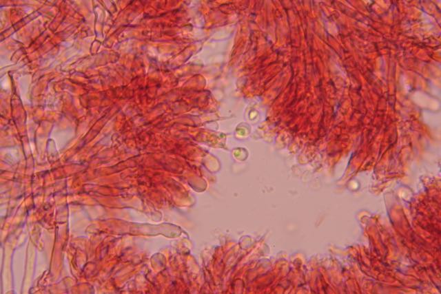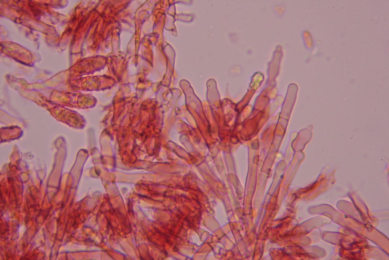Zweimal konnte ich auch inkrustierte Zystiden (?) finden (oben rechts von Mitte):
