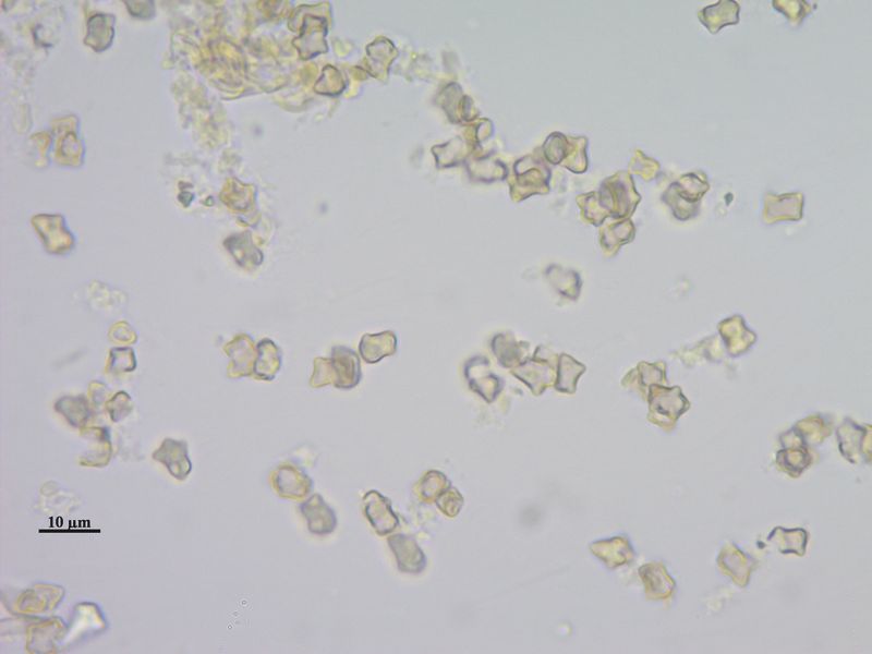 Bleibt noch deine Frage, zu meiner Einschätzung der Inocybe. Also außer dem Umstand, dass mir die Sporen viel zu höckerig vorkommen - Kuyper hat den Holotyp untersucht und die Sporen abgebildet und in Übereinstimmung mit Velenovsky als "angular-subnodulose" beschrieben, mir auf die Sporen von Hartmuts Inocybe gar nicht zu passen scheint. Also abgesehen davon sollen die Sporen von soluta sehr aufffallend blass sein. Das sind die von Hartmut aber nicht - zumindest nicht nach dem Foto zu urteilen. Aber schau dir die Sporen von einer unserer solutas an, die sind sowohl wenig höckerig als auch blass - die wirken immer so irgendwie "ungreifbar", ganz seltsam. Ich häng ein Foto an.