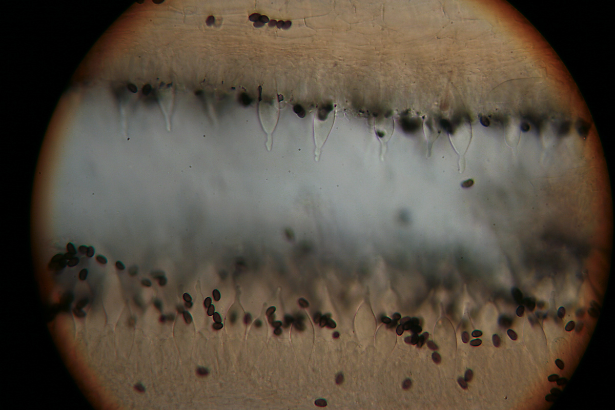 Hier noch ein Bildchen (mit KOH, 320x) von so einem ganz jungen Frk., gerade mal Ø 12 mm und noch geschlossen. Da sind die Pleurozystiden (noch?) dicht gedrängt, aber keinerlei Tropfen drin. Vielleicht magst Du das bei Deiner Artbeschreibung ergänzen?
