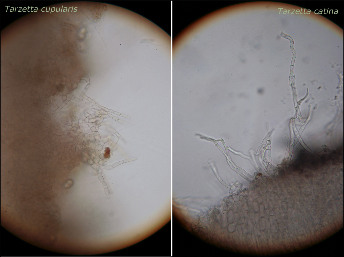 Hallo Till, merci für Deine ausführliche Antwort! Mit Deinem ersten Absatz irritierst Du mich doch sehr: catinus soll einen deutlichen Stiel haben und cupularis sitzend und ohne Stiel?? Mit der Ø-Zuordnung der Apos gehen wir einig. Über die andere Tarzetta-Arten kann ich (noch) nicht mitreden. Vorhin habe ich den Aufsatz von YAO/SPOONER Notes on British Species of Tazzetta (2002) durchgelesen, wundere mich bei deren Schlüssel über die Sporenmaße → cupularis hätte demnach (im Schnitt) die größeren Sporen. Vom Stiel schreiben sie nichts, über velata auch nicht. (http://www.ascofrance.com/uploads/forum_file/15089.pdf) Wodurch unterscheiden sich cupularis und die var. velata? Oder ist velata eine eigenständige Art (geworden)? Mit größeren Sporen (daher die großen cupularis-Sporen im SPOONER-Schlüssel?) und wolligerem Rand? Wo finde ich Mikro-Bilder von den Randhaaren? Von unterschiedlichen (Rand-)Haaren finde ich nirgends was. Bei meinen aktuellen Kollektionen sieht das so aus, siehe Foto. Falls sich jemand für "meine" T.cup. + T. cat. interessieren sollte: im Moment gibt es beide im reifen Zustand (falls sie nicht irgendjemand alle abgefressen hat) – kleiner Sonntagsausflug gefällig? Viele Grüße – Rika