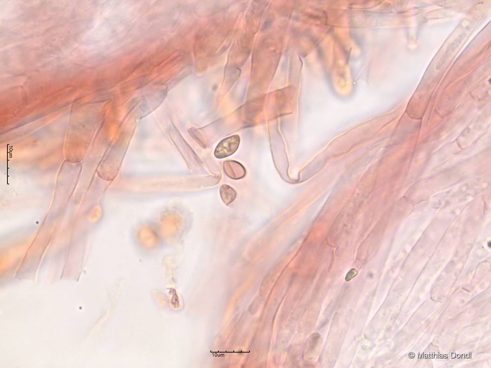 Sporen: gedrungen fusoid bis gerundet rautenförmig, basal und apikal verjüngt, oft mit leichter subapikulärer Depression, inamyloid; Maße: 7,3 x 4,4 (6,3-8,7 x 4-5), Q=1,67;