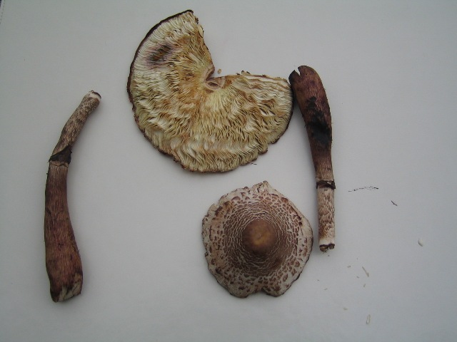 Liebe Pilzfreunde, der abgebildete Pilz wurde mir als "Safran-Schirmling" vorgelegt. Ich hatte meine Zweifel und bin beim Versuch, den Pilz zu bestimmen bei Leucoagaricus bresadolae gelandet. Wuchsort: Friedhofs-Parkplatz büschelig auf Holzschnitzel Hut ca. 15 cm mit stumpfem rotbraunem Buckel, auffällige helle Randzone Stielspitze hell, unter dem Ring bräunlich, bei Berührung rot anlaufend Lamellen cremefarben, frei (mit Collar ??) Geruch angenehm Der ganze Fruchtkörper verfärbt sich bei Verletzung erst orangegelb, dann sehr schnell weinrot Die Ammoniakreaktion in den Lamellen war innerhalb Sekunden grün Kann jemand meine Bestimmung bestätigen? Gruß