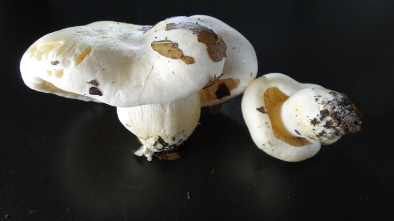 was habe ich hier gefunden. Ich tendiere in Richtung Ritterling, und da zum Weißen Ritterling (Tricholoma pseudoalbum). Leider ist der Pilz etwas verwachsen und somit wohl untypisch von in seiner Form.