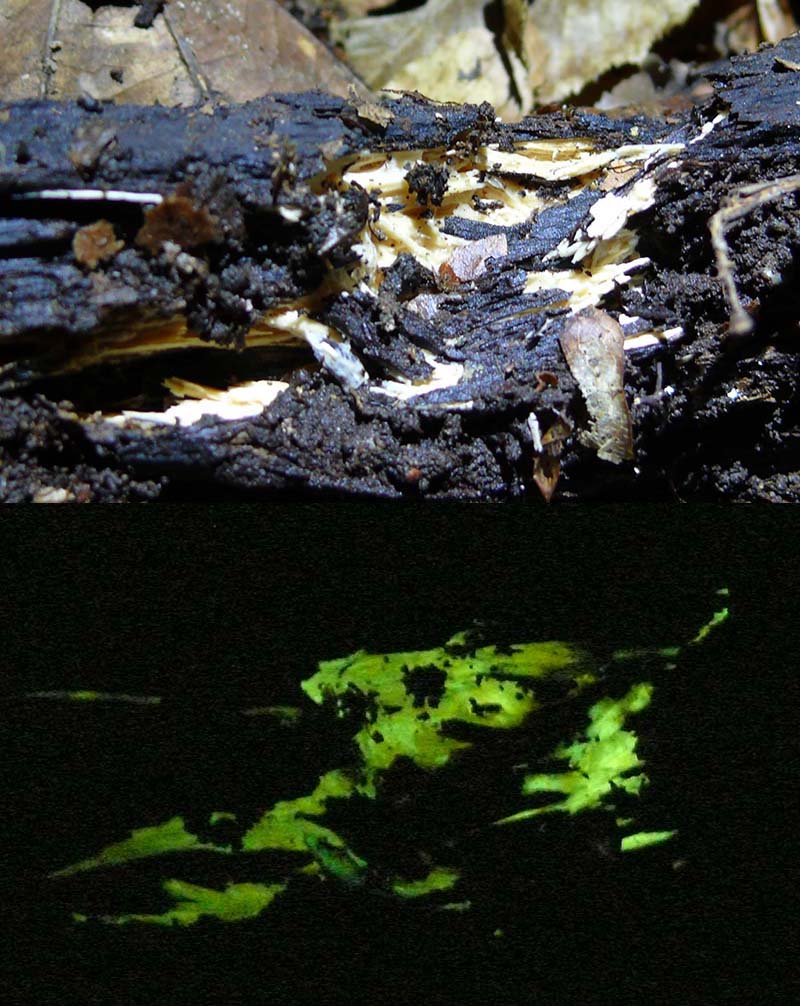 Doch, es gibt gerade wieder Leuchtholz im Wald, einem ausgesprochen Hallimasch-lastigen Wald im Kreis Düren, allerdings ohne dass da auf dem Holz wirklich Hallimasch oder sein Myzel zu sehen wären. Wichtig scheint zu sein, dass das Holz erst kurz vorher aufgebrochen oder freigelegt wurde, damit die leuchtenden Schichten überhaupt wahrgenommen werden können. Das kann man dann aber auch ohne lange Anpassung an die Dunkelheit sofort mit den Augen sehen. Oben mit Beleuchtung, unten gleiches Stück Holz ohne Beleuchtung, 1600 ASA, 60 sec., Blende 2,8: