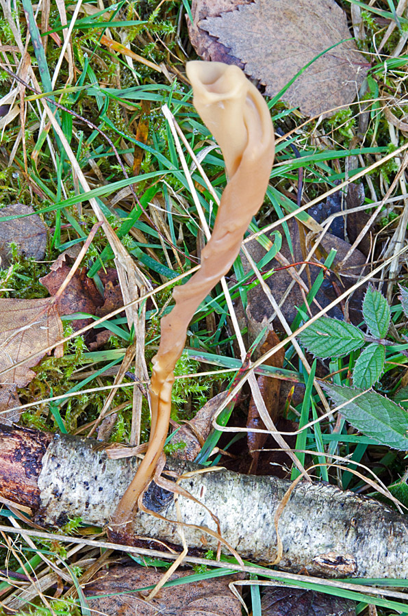 Aufgewachsen auf einem Birkenast, im feuchten Gras am Waldrand.