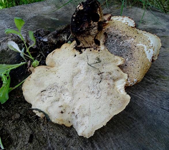 Bei den Porlingen bin ich immer etwas unsicher. Und für Bestätigungen oder Korrekturen bin ich dankbar. Dieser erste dürfte wohl Polyporus squamosus sein. Er gedieh auf diesem Fichtenstubben. Foto. Könnte das stimmen?